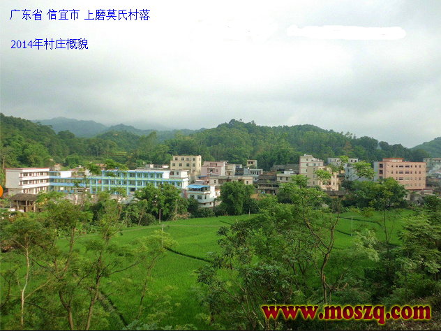 我的故乡上磨,地处云开山脉腹地,位于信宜市西北角。在地球上的经纬度处于东经110.77度,北纬22.44度。属亚热带季风气候,兼具复杂多变的山区气候特点。盛产稻谷丶木薯丶番薯丶茶叶等粮食及经济作物。森林资源丰富,多产松衫丶竹丶藜木以及砂仁丶田七丶肉桂丶八角等中药材。有香蕉丶龙眼丶芒果丶荔枝丶黄皮等岭南佳果。上磨属于广东省信宜市金垌镇村一级行政村庄,其由上磨丶六山丶付子丶大木田丶细垌冲丶大塘丶羊史丶竹沙尾丶十担租丶镰勾丶青社丶旺竹坪丶杨屋丶菜塘等多个自然村联合组成,统称上磨村民委员会,村委设在上磨村。上磨过去曾称上磨乡丶上磨大队丶上磨管理区,可见名称的变化在一定程度上反映着这座村庄在不同时代里的变迁。上磨全乡面积14平方公里,有山林3万亩,可耕田900亩,总人口约3500人。(不含外迁户)。全乡人口以莫丶王丶和,麦四大姓氏为主,莫氏占其总人口50%左右,莫元宝公(明朝弘治1488年-明朝嘉靖1522年)为上磨莫氏始祖。自明朝约1508年上磨莫氏始祖元宝公居于此福地,繁衍了二十世。后裔主要聚居分布在上磨丶竹沙尾丶六山丶羊史丶菜塘等自然村落,外迁的主要有迁往广西丶海南丶马来西亚等地。上磨莫氏历史上名人有元宝公十世孙前清武秀才-量珠公,清大学仕丶九品登仕郎丶文林郎-量宝公.解放前参加革命的有莫名声(烈士)莫家周等人,解放后成长为处级干部有莫日生,莫家尧丶莫家源丶莫世旺等人,改革开放勇闯特区致富的典型有莫世戈